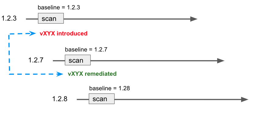 • For container images, the baseline is latest or the most recently scanned Semantic Version number if it can be detected, such as