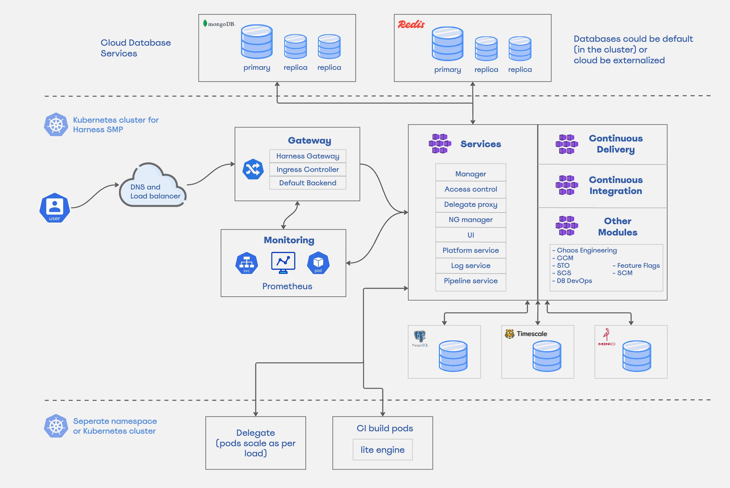 The below diagram show the architecture of Harness Self-Managed Enterprise platform, detailing internal services, data stores, networking components, and their interactions within a Kubernetes environment.
