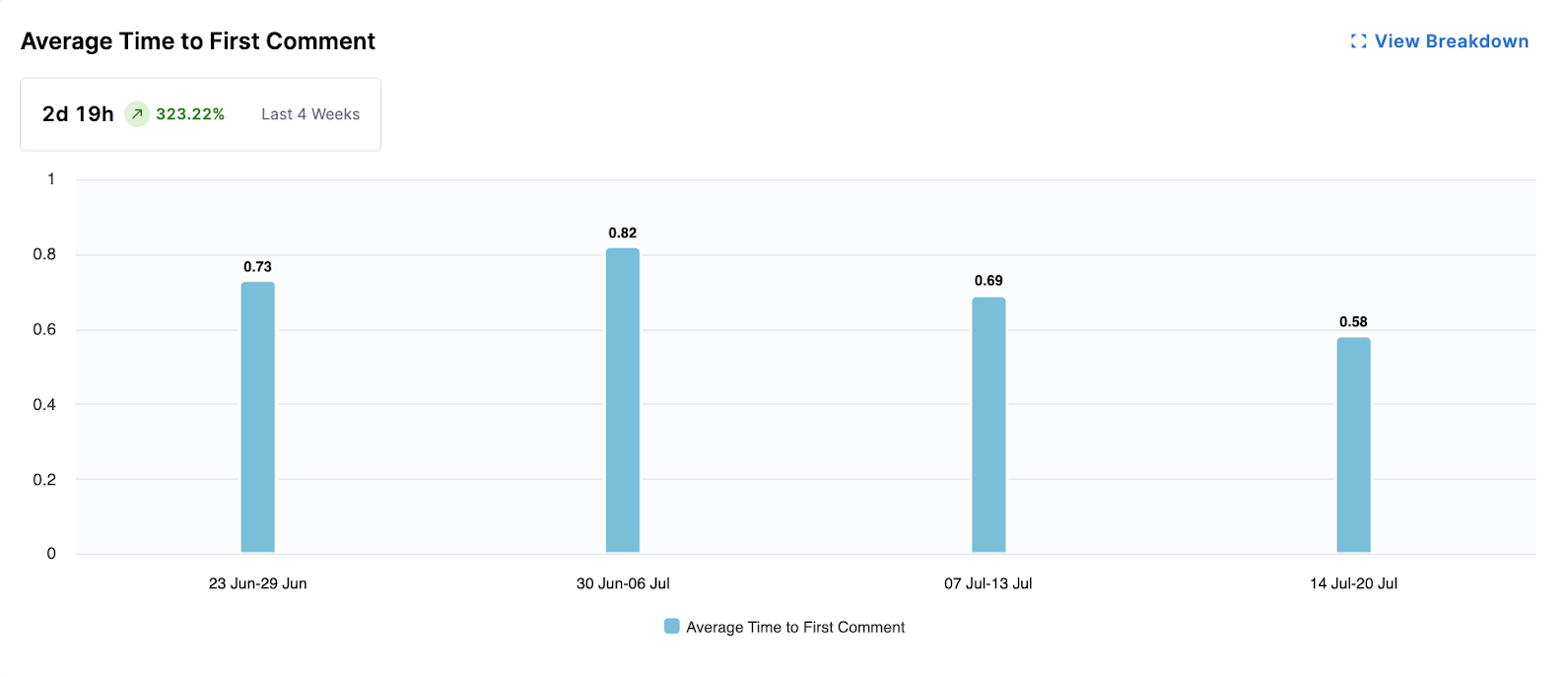 - Metrics Displayed: Average time to first comment (e.g., 3d 8h).