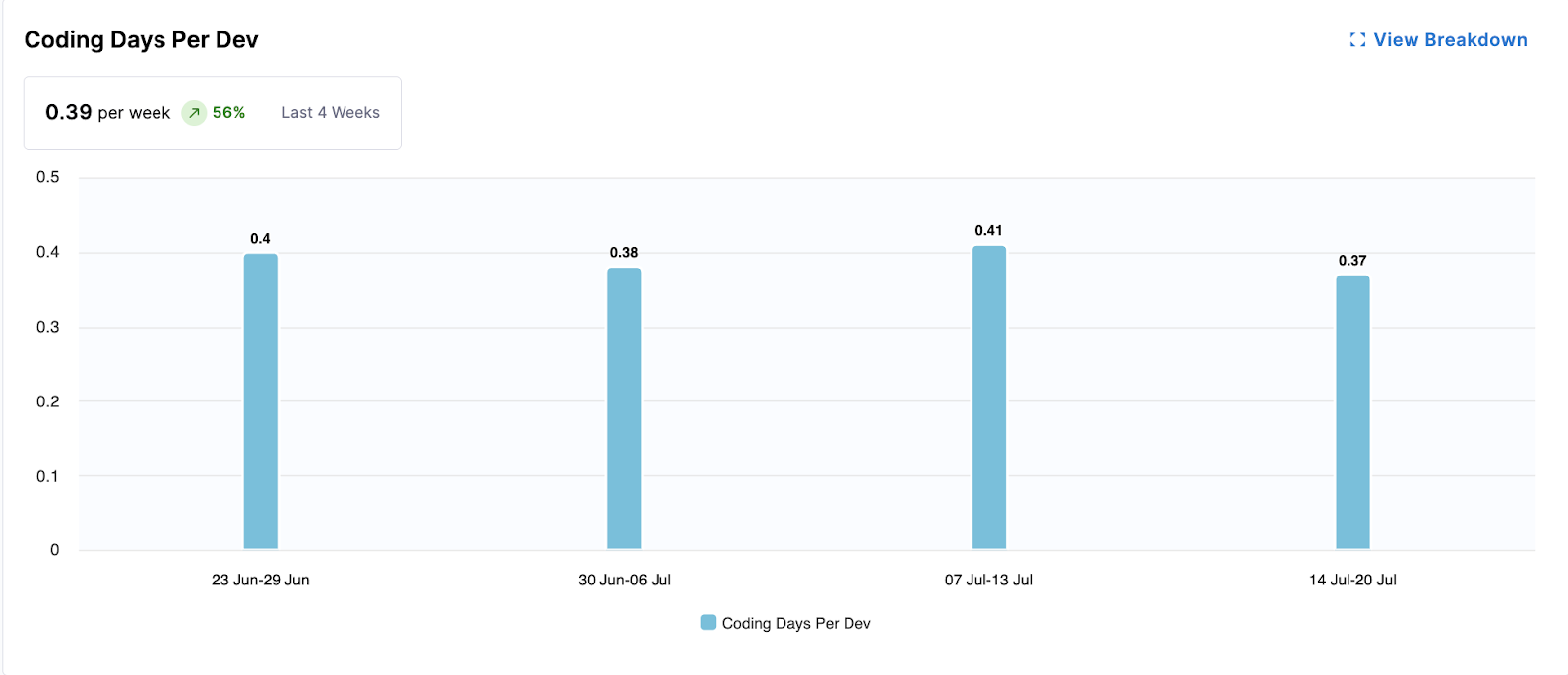 - Metrics Displayed: Average coding days per developer per week (e.g., 0.23 per week).