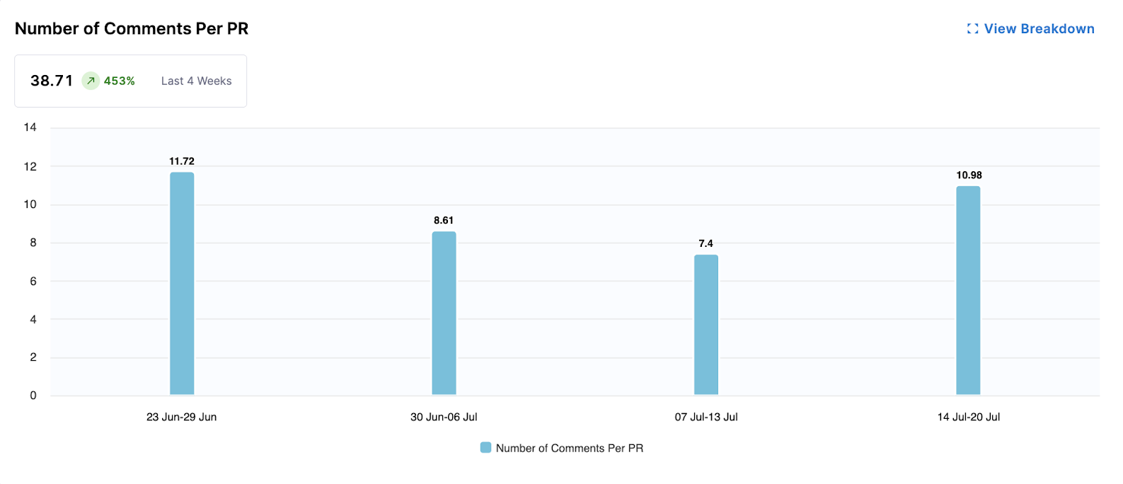 - Metrics Displayed: Average number of comments per PR (e.g., 2.5 comments).