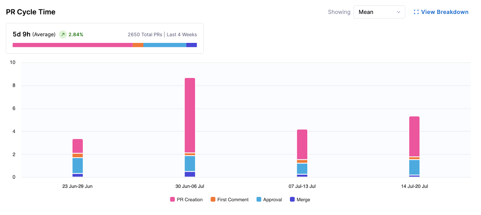 - View Breakdown: Provides a detailed breakdown of PR velocity by teams or individual developers, and offers a drill down to specific PRs.