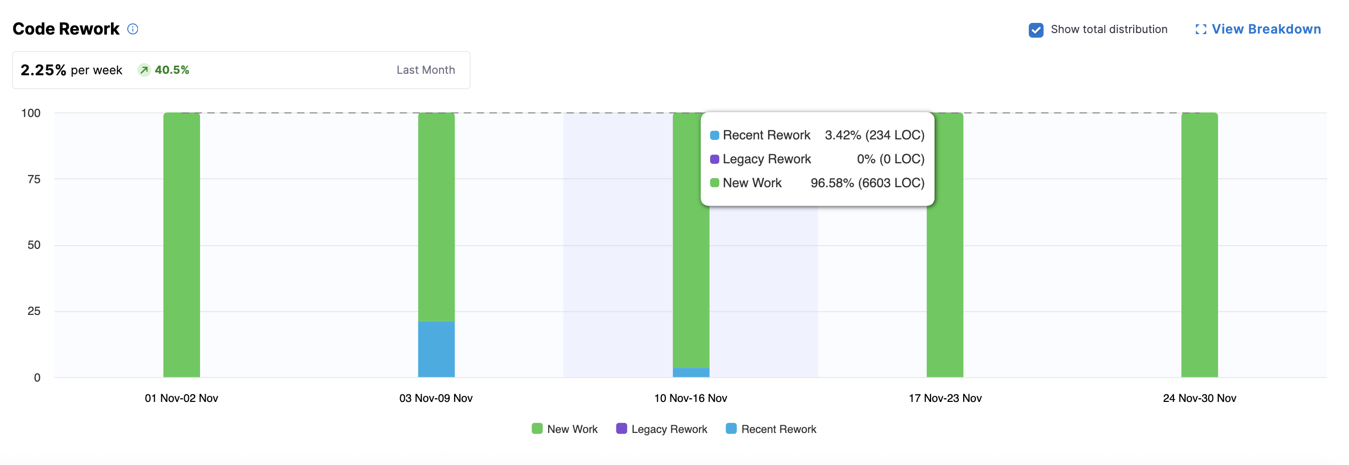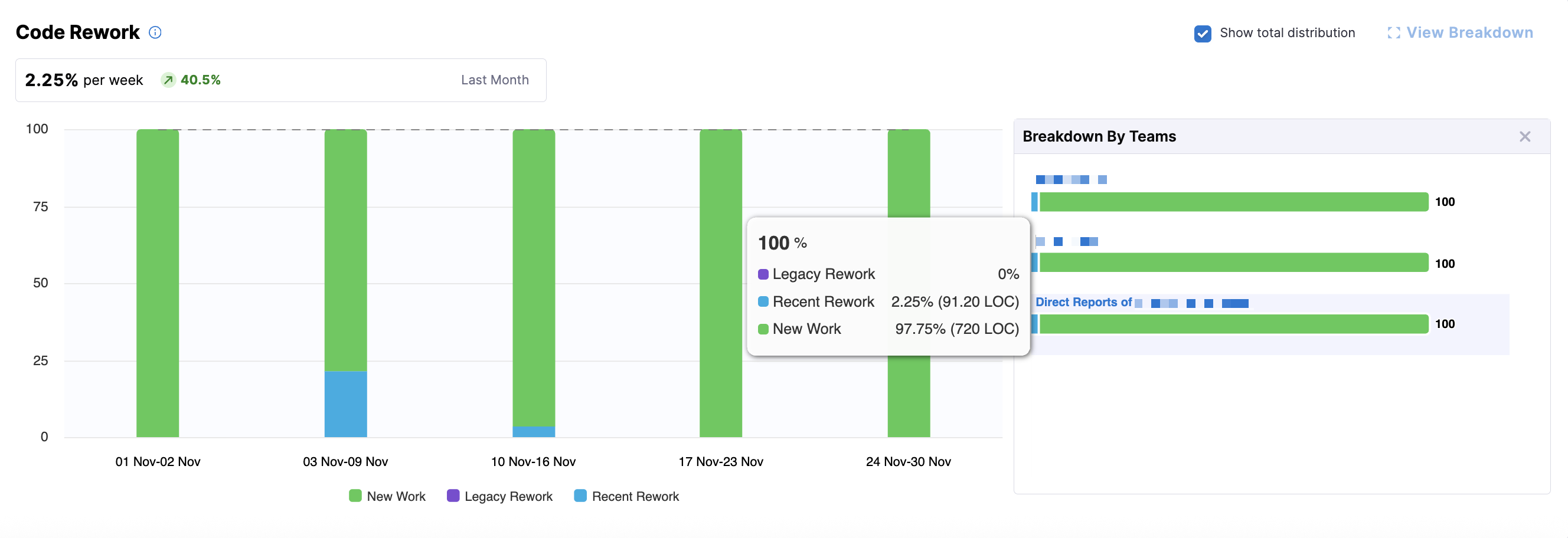 The summary metric highlight trends in code rework and the bar chart displays rework percentages over time. You can hover over a bar for a specific week to see the split of Recent Rework versus Legacy Rework.