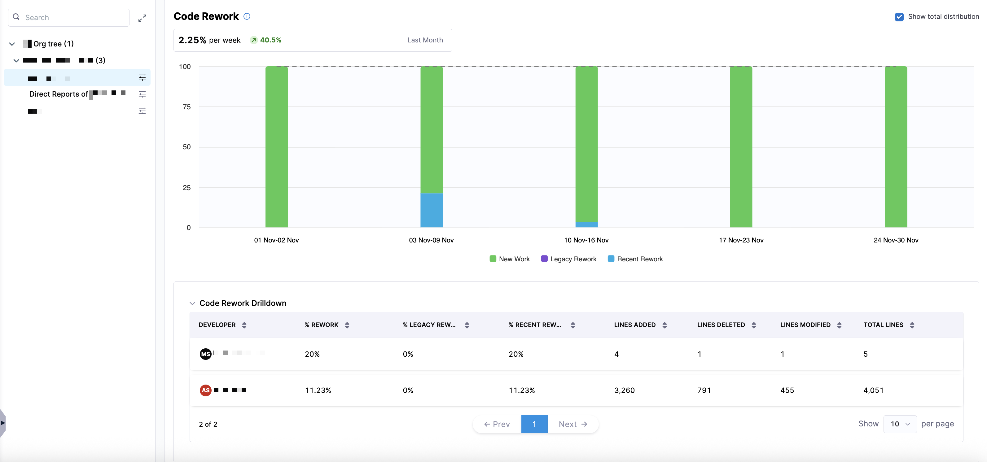 You can explore team-level and individual developer metrics by clicking on a team or a leaf node in the Org Tree. At the leaf team level (e.g., an engineering manager's team), you can access the Code Rework Drilldown, which displays metrics for individual developers.