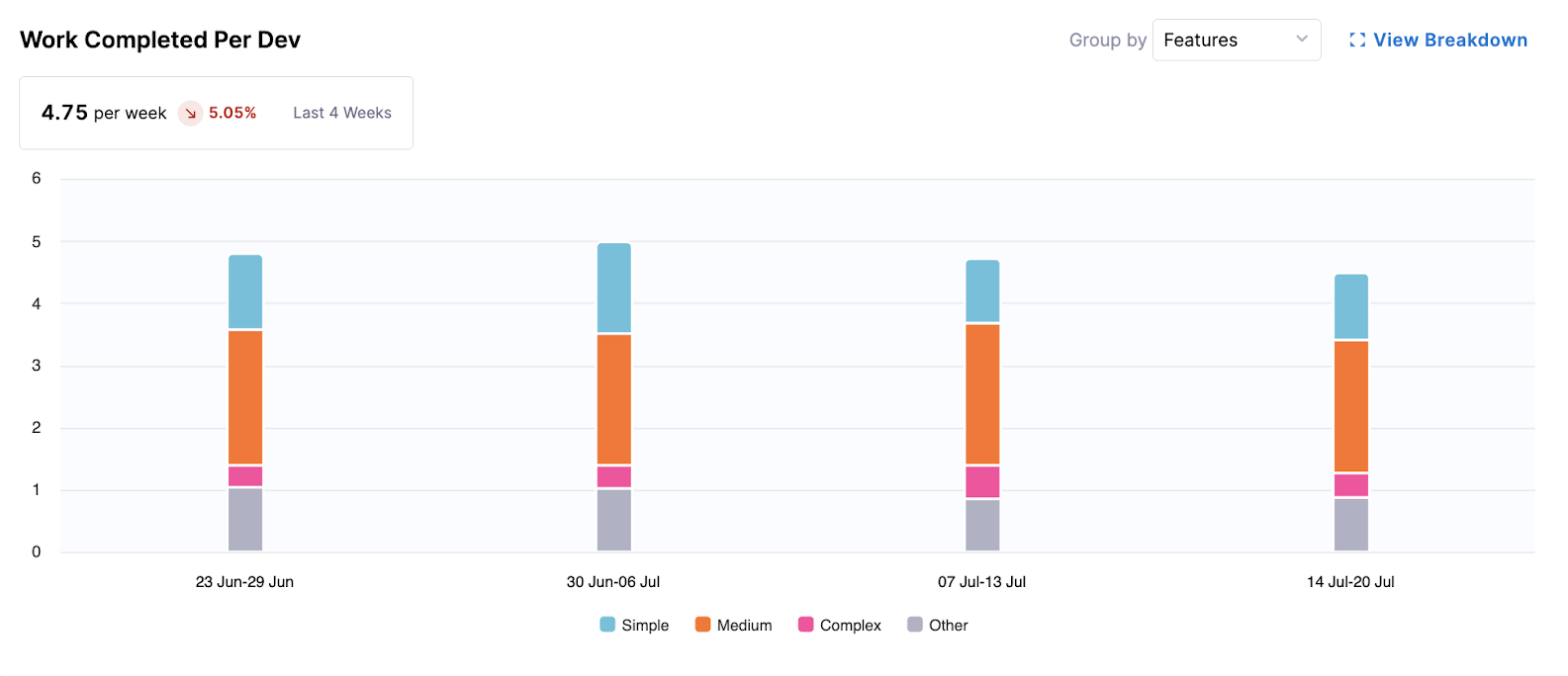 - Visualization: A bar chart showing work completed per developer per week, segmented by complexity: Simple, Medium, Complex, and Other.