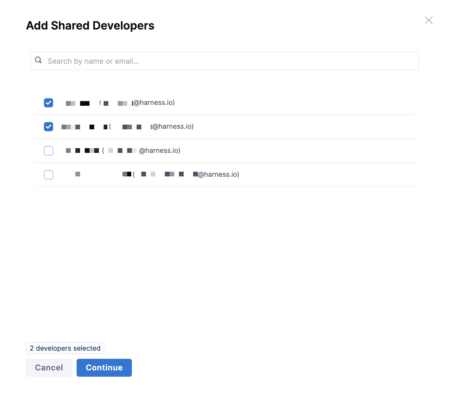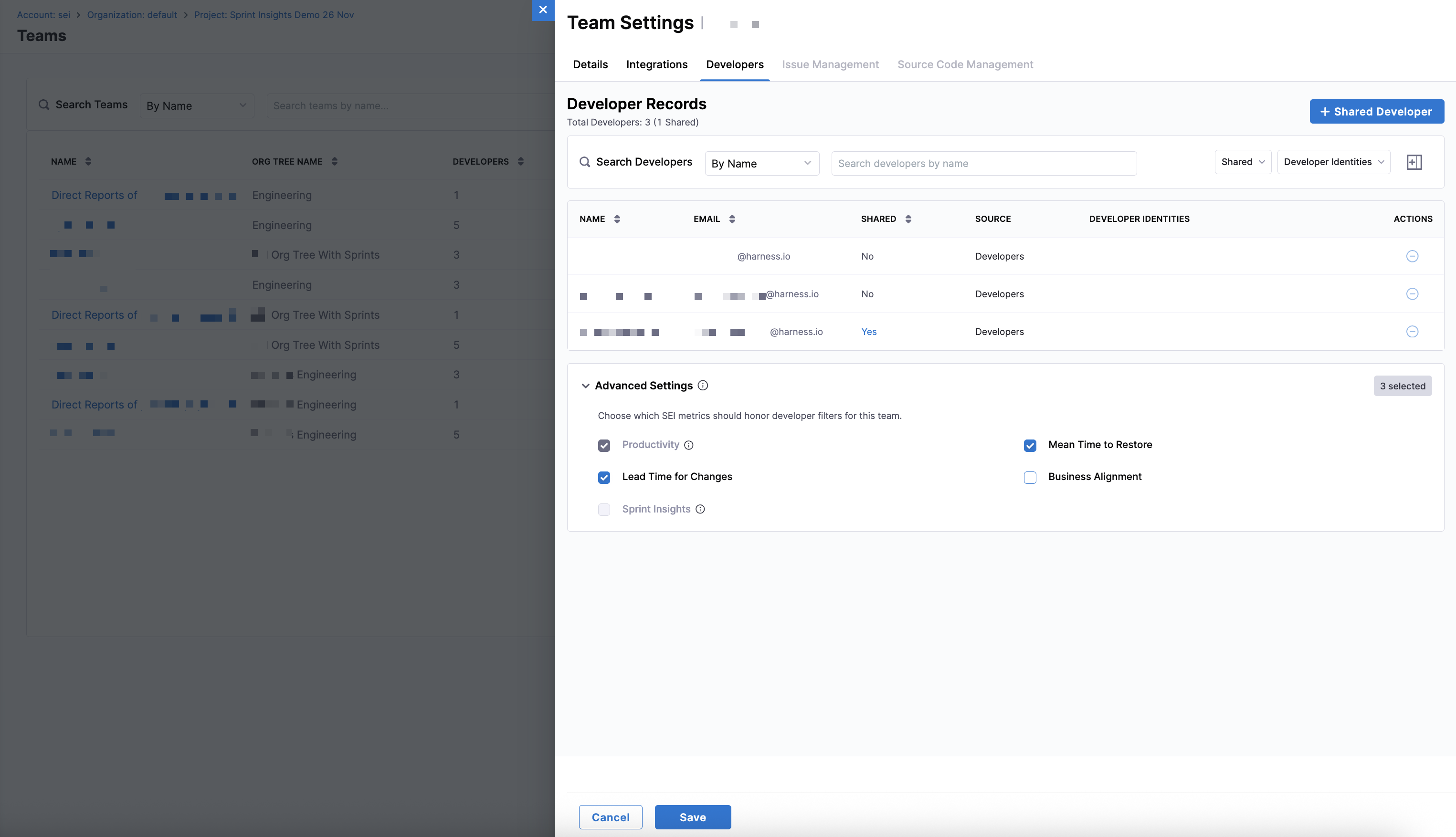 However, some contributors, such as engineering managers or individual developers who regularly contribute across teams, may not belong to the selected team's leaf node in the Org Tree. For these cases, you can add them as shared developers, which appear with Shared: Yes and Source: Manual.