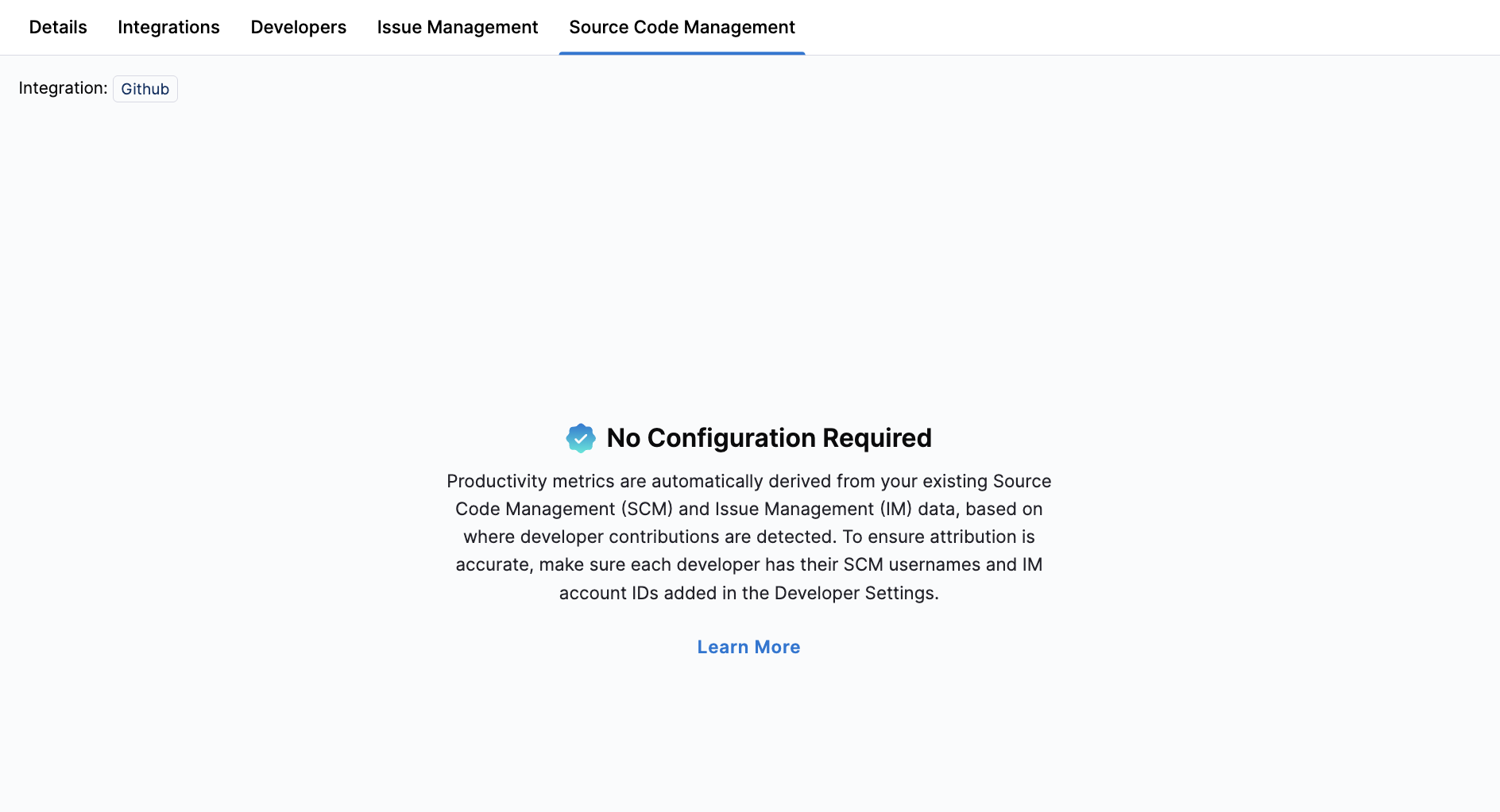 After selecting your team's integrations and mapping developer identities, configure tool-specific settings to control how SEI 2.0 interprets data from each system. Proper configuration ensures that metrics on the Insights page accurately reflect your team's workflows, tools, and operational context.