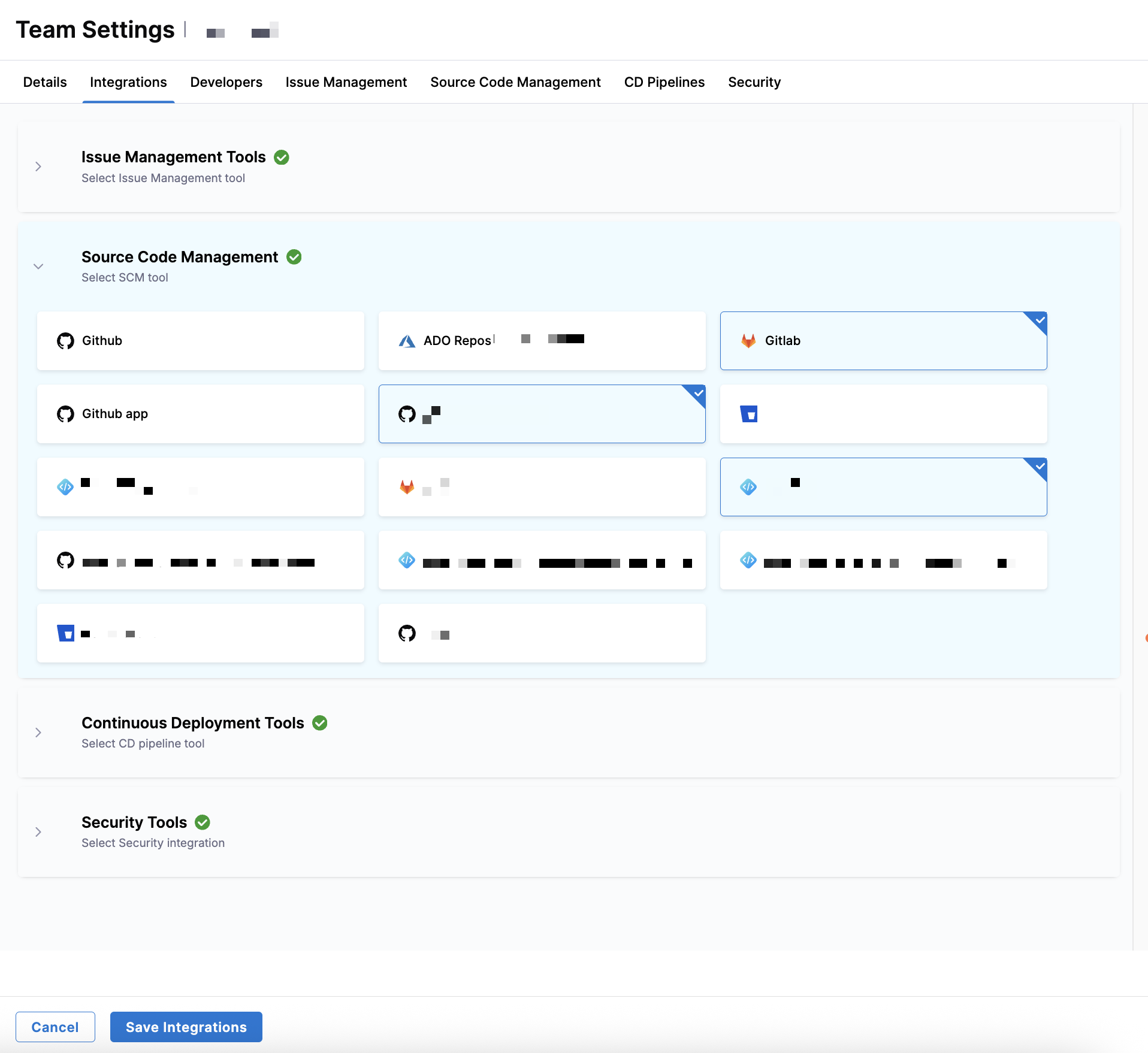 Select integrations from the following sections: Issue Management, Source Code Management, Continuous Deployment, Security, Incident Management, and Code Quality. You can select multiple SCM integrations per team.