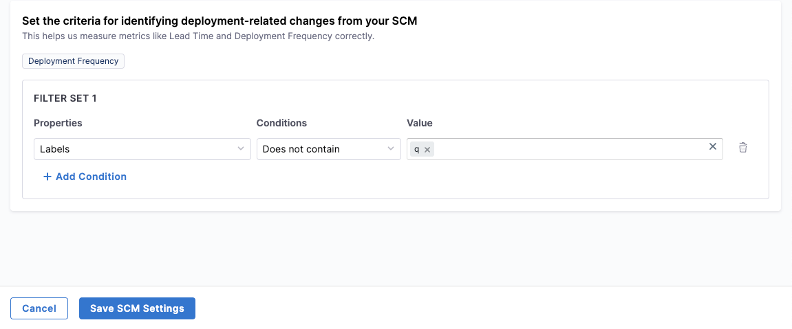 Correctly defining repositories, branches, and deployment-related criteria ensures SEI 2.0 accurately calculates Lead Time for Change and Deployment Frequency, especially when multiple SCM integrations are configured.