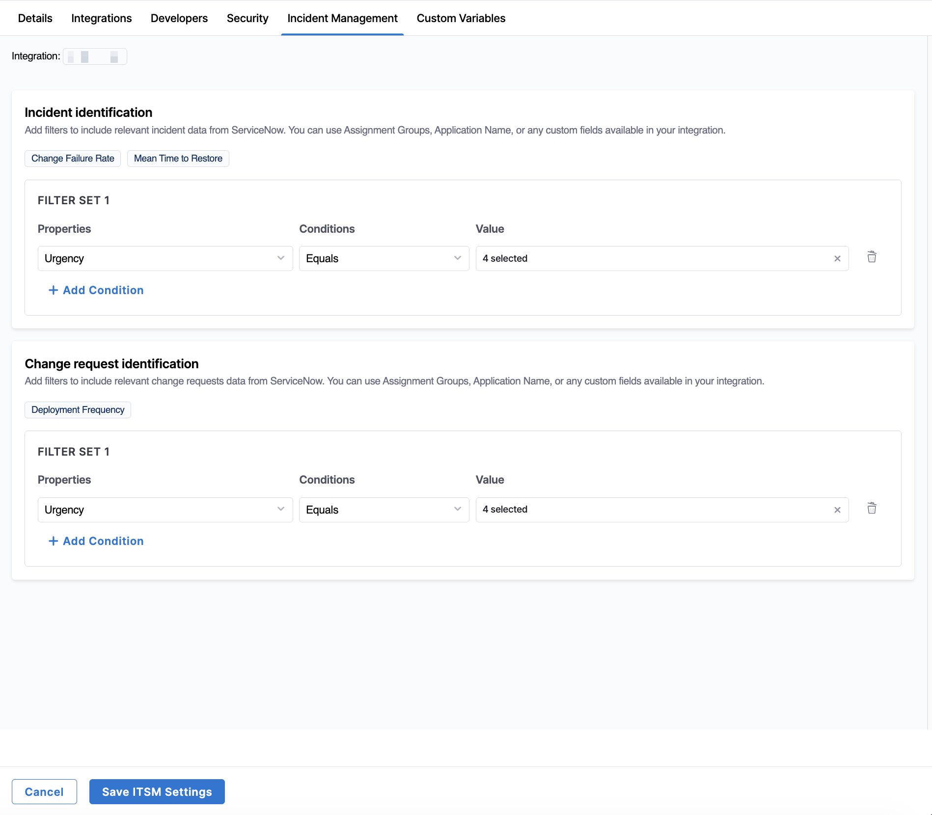 Use the Incident Management tab in Team Settings to define how SEI 2.0 maps incident and change request data from ServiceNow to your teams. Filters determine which records are included in metric calculations.