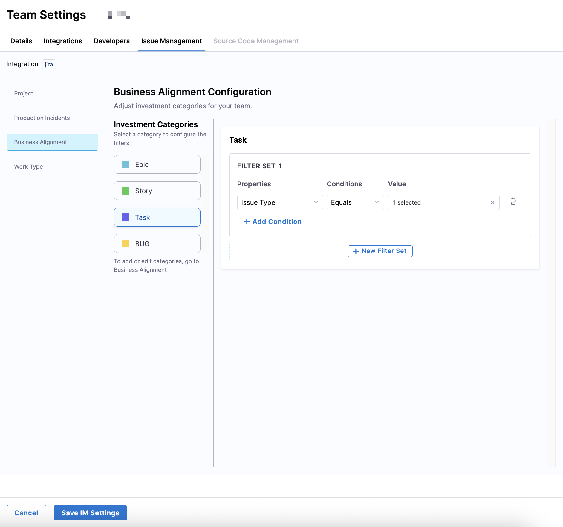Use the Issue Management tab in Team Settings to define which work items are relevant to your team and how they should be interpreted for metrics calculation. These settings control how SEI 2.0 scopes work, identifies incidents, categorizes investment, and classifies different types of work.