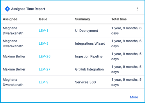 • Issue Assignee Time Report: A table of issues that have sat with the same assignee for the longest amount of time.