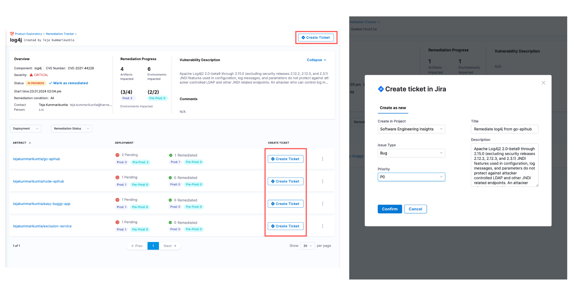 In the tracker, you can easily create Jira tickets for individual artifacts. Simply click the 'Create Ticket' button located to the right of the artifact list item. This will open options to configure the ticket details, with the artifact details automatically populating the Jira ticket creation fields. Similarly, you can create tickets at the tracker level by clicking the 'Create Ticket' button in the top right corner of the screen. However, before proceeding, ensure that your Jira account is connected to Harness using the Harness Jira connector. For more information on this, you can refer to Connect to Jira document.