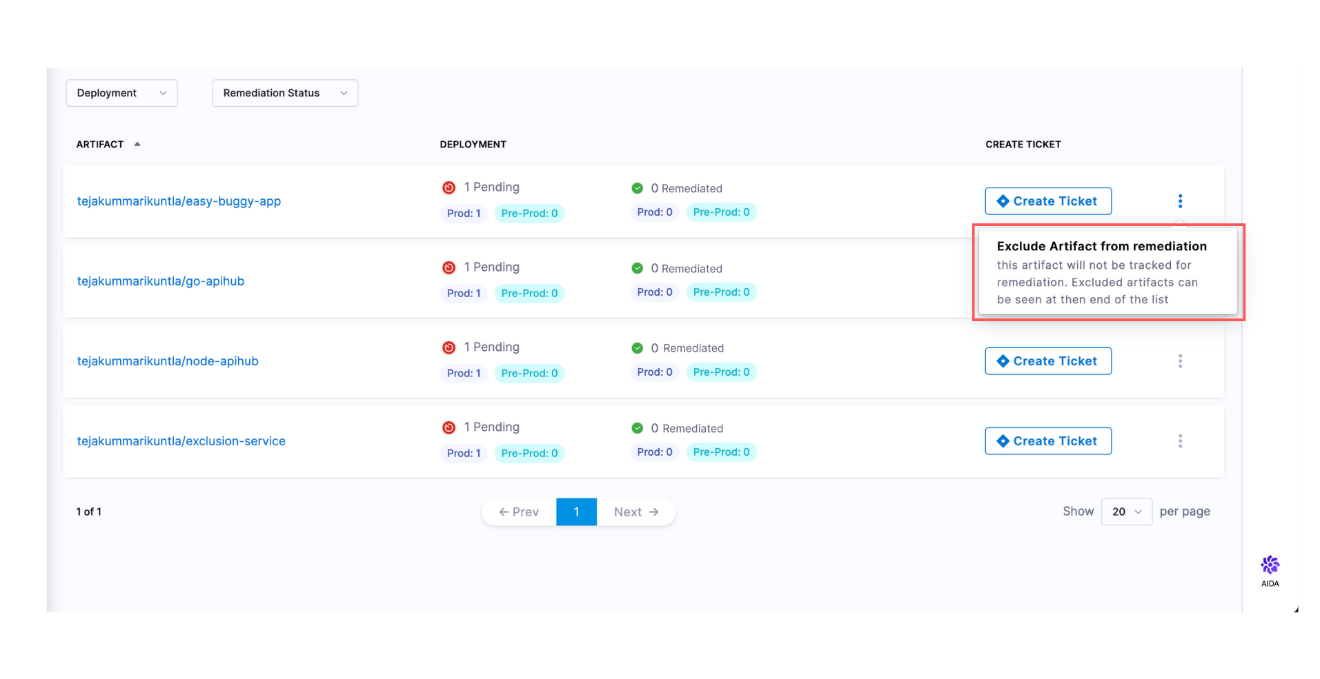 While the tracker lists all artifacts and includes them in the remediation process by default, it also offers the flexibility to exclude any artifact. To do this, click on the ellipses (…) in the list and select 'Exclude Artifact from Remediation.' This action will permanently remove the artifact from the process.