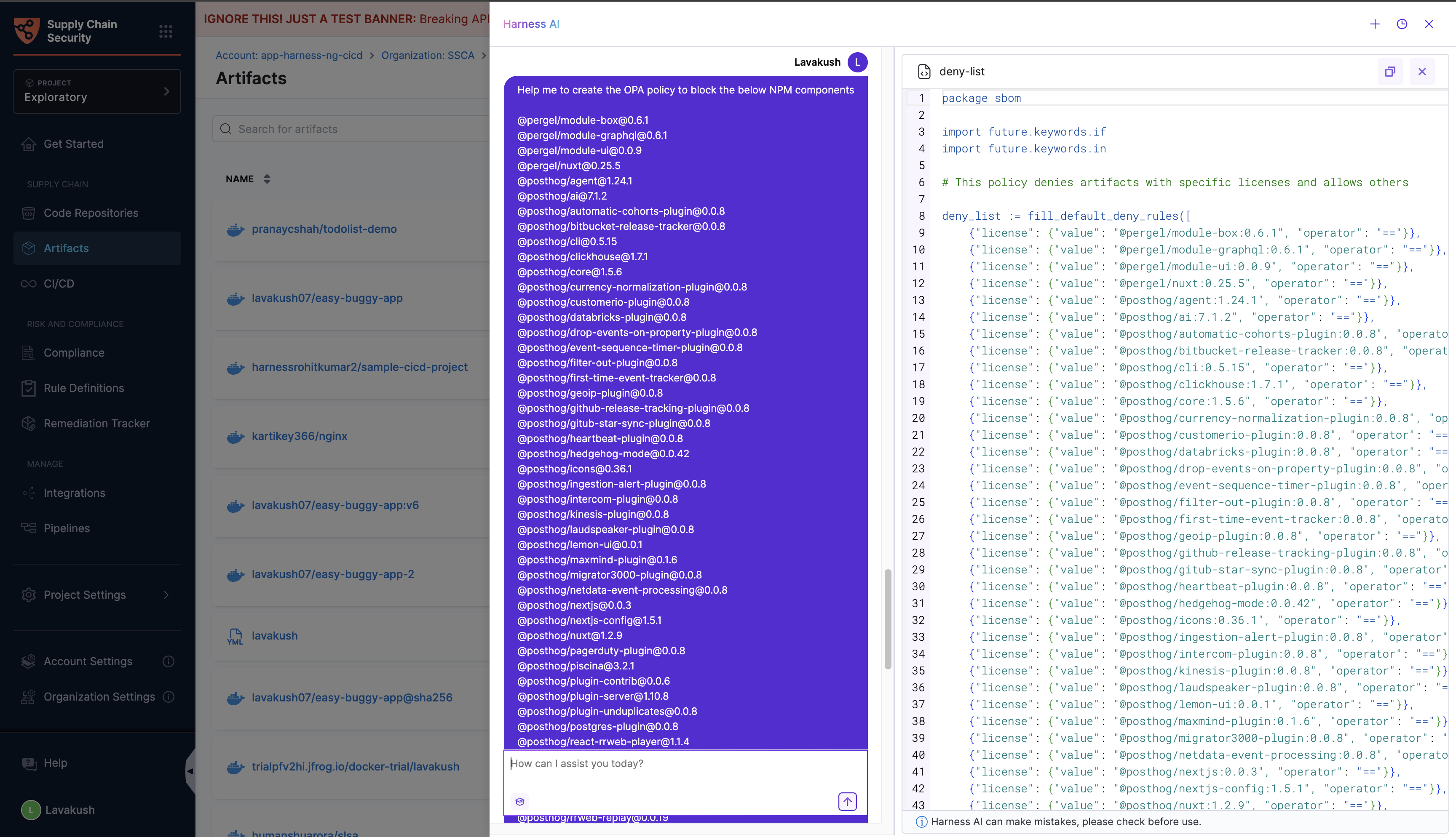 The AppSec Chatbot in Harness SCS lets you explore SCS data using natural language. Instead of navigating multiple dashboards or applying several filters, you can simply ask questions like "Show me all scanned artifacts and code repositories".