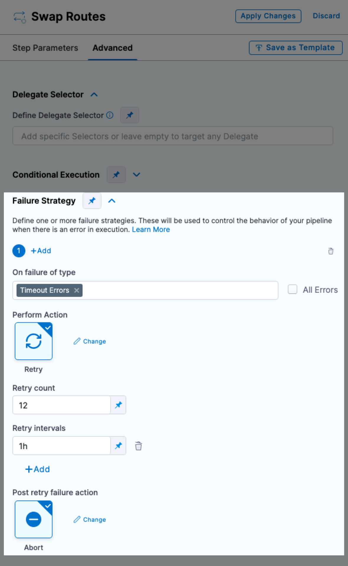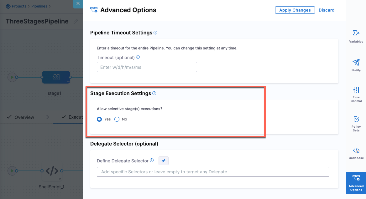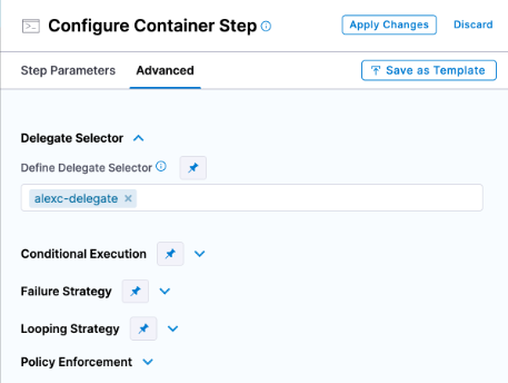 - Fixed an issue where the pipeline's Advanced Option did not show the delegate selector configured in the pipeline template. For pipelines created from a template with a pipeline-level delegate selector (for example,