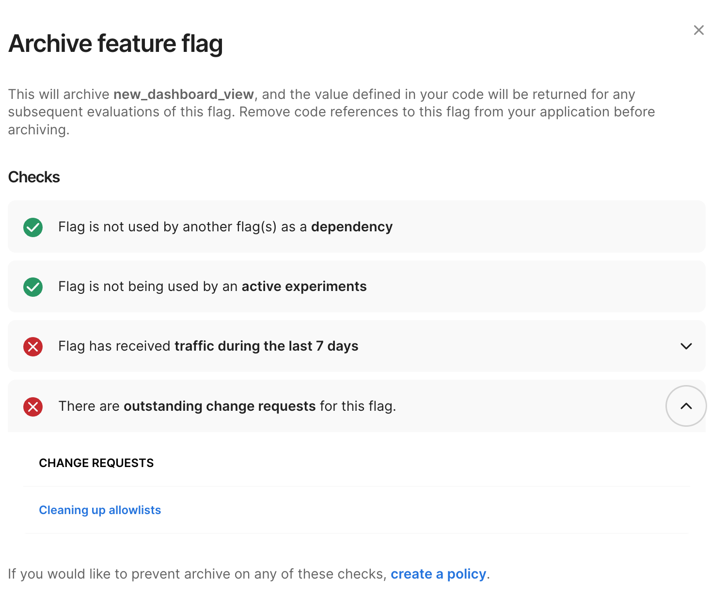 Before a flag can be archived, Harness FME performs pre-archive checks and blocks archiving if the flag is used as a dependency and issues warnings for active experiments, recent traffic, or outstanding change requests.