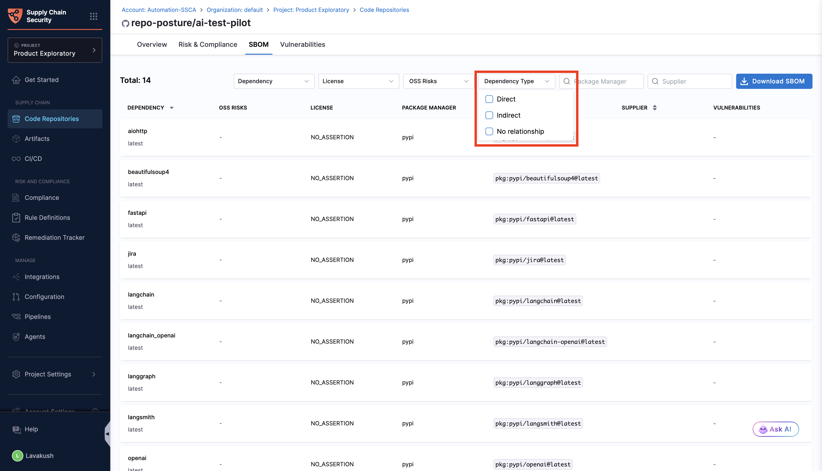 • Filtering SBOM components by Dependency Type (Direct, Indirect, No Relationship) for code repositories is now Generally Available (GA). This feature was behind the feature flag SCS_DEPENDENCY_SEGREGATION.